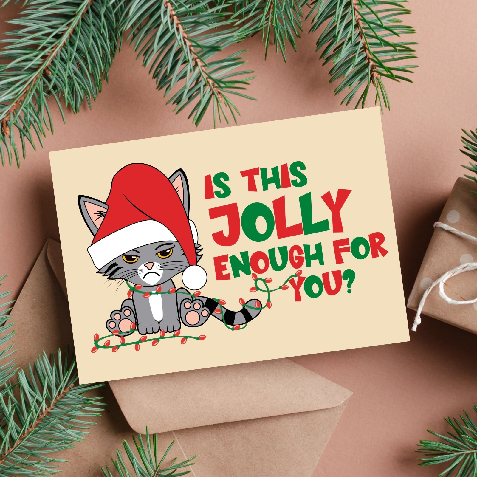 This cat-themed Christmas card pairs an unimpressed holiday cat with the line “Is this jolly enough for you?” aka the exact look cats give when humans go overboard with tinsel and matching pyjamas.